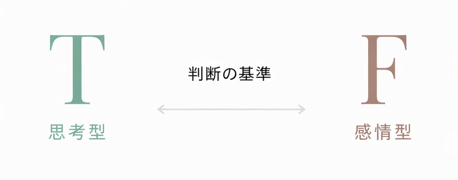 判断の基準をどこに置くかの軸です。T(思考)は論理と筋道、F(感情)は人の気持ちと関係性を基準にしやすい傾向があります。