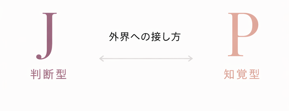生活スタイルや動き方の軸です。J(判断)は先に決めて動く、P(知覚)は状況を見ながら決める傾向があります。