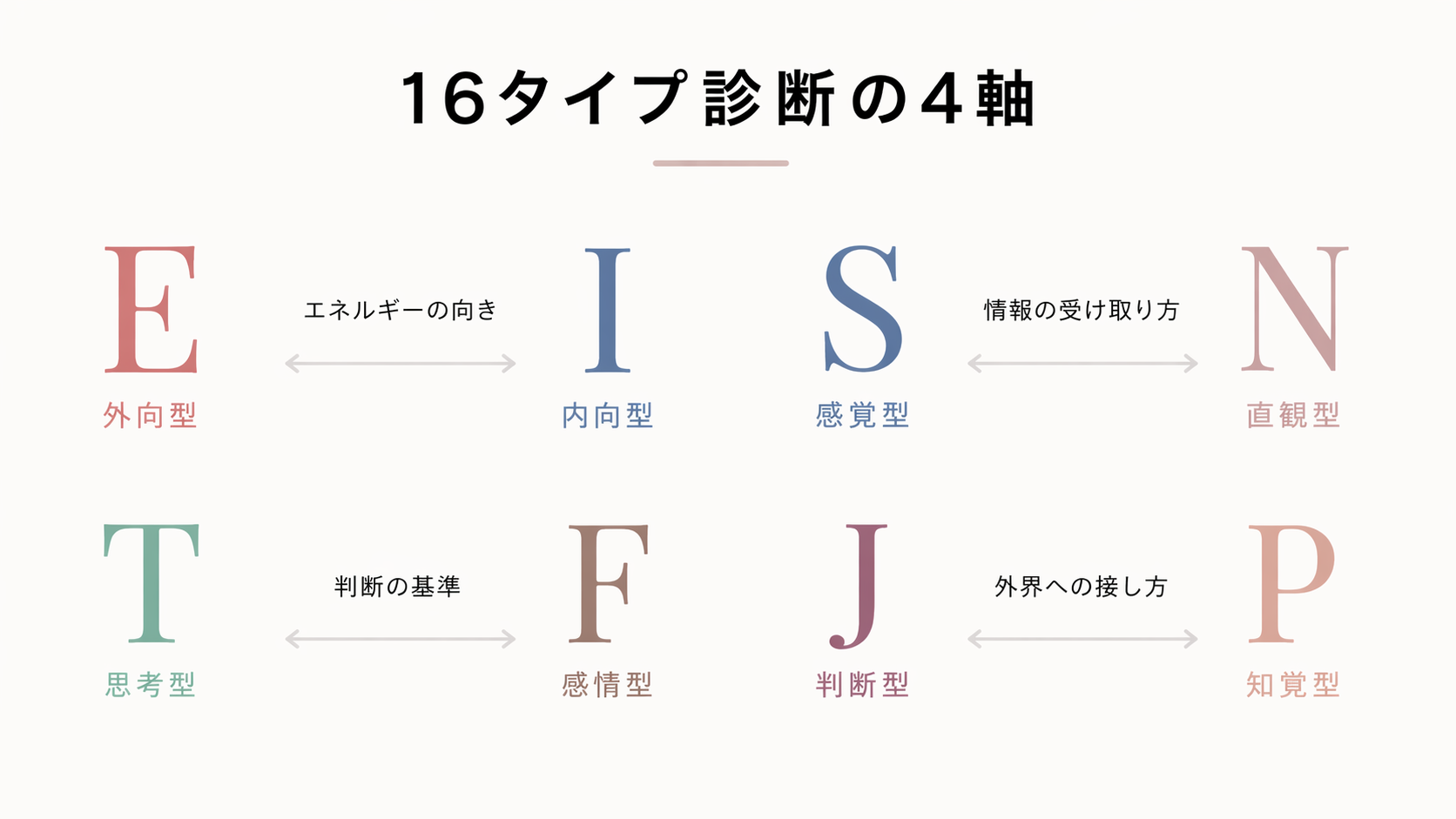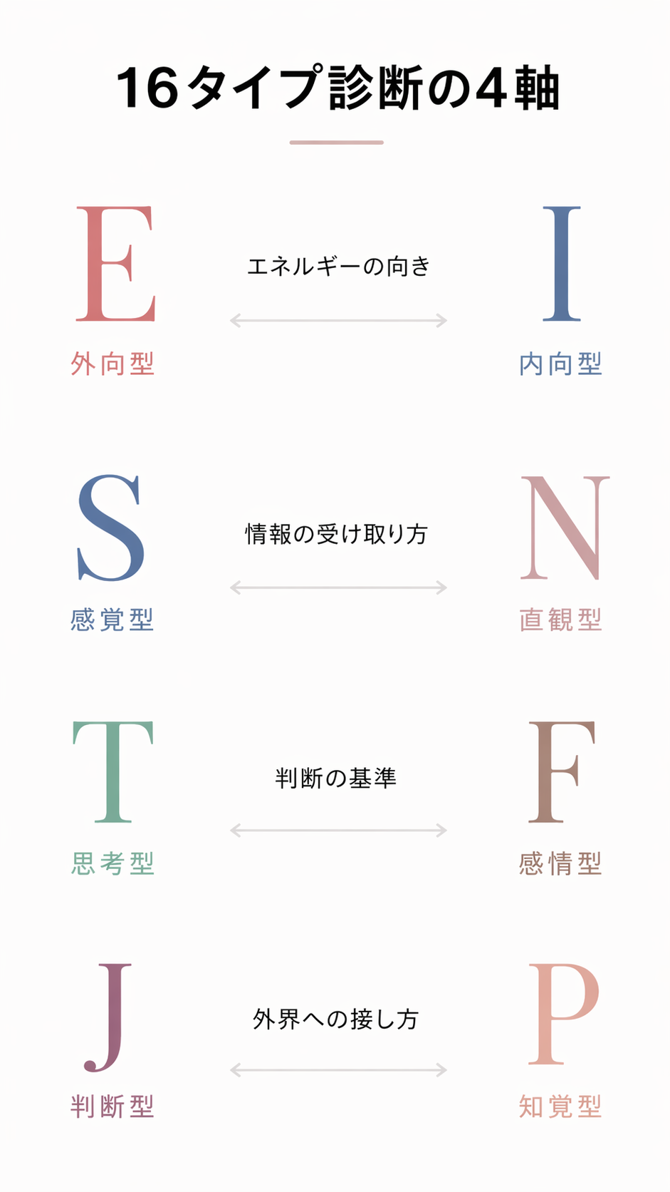 16タイプ診断の結果は、下記4つの軸の組み合わせで決まります。まずは自分がどの文字に寄っているかを押さえると、タイプ名の意味が一気に読み解けます。