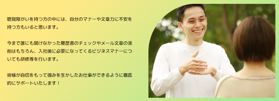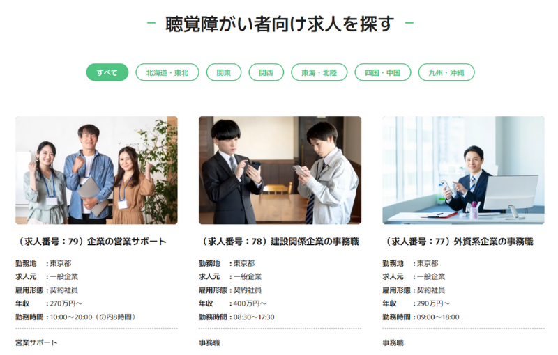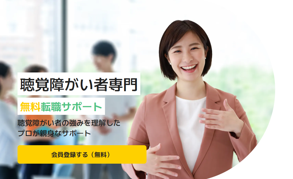 公式サイトでも「手話で会話できる職場を紹介してほしい」という要望に対し、条件に応じて求人を探せると明言しており、聴覚障害者が働きやすい環境づくりを前提にサービスを提供しています。