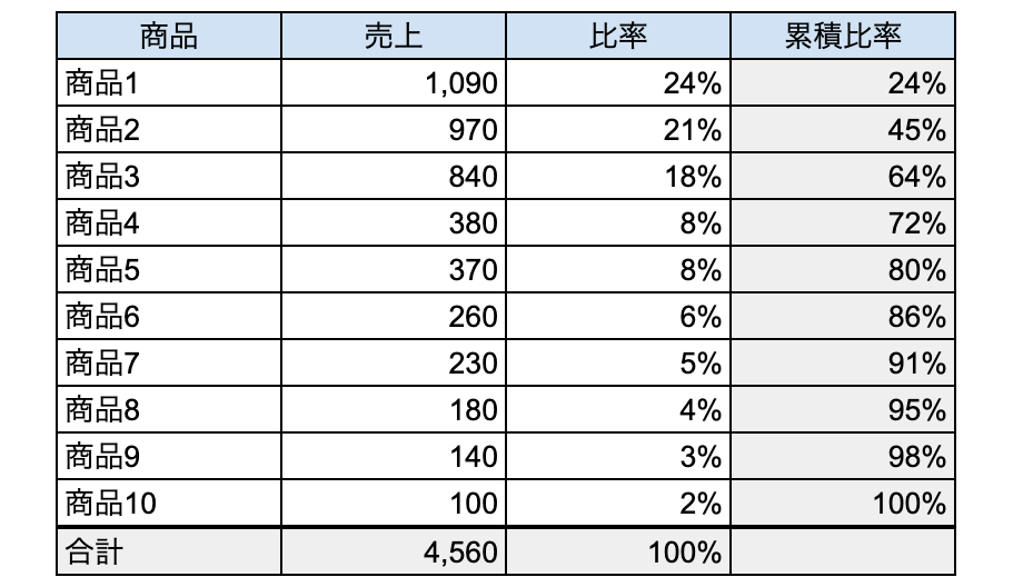 なお、一番右列の「累積比率」とは、各比率を高い順に足したものです。(例えば、商品1〜3で合計64%、商品1〜5で合計80%を占めていることがわかります。)